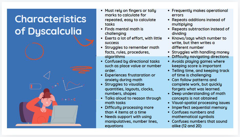Dyscalculia is a specific learning disability that makes math difficult to process and understand. This results in consistent failure to achieve in mathematics regardless of age, intelligence, instruction, or effort. There are some common misconceptions about dyscalculia. It is not just being “bad” at math. It is a neurological condition that affects number sense, mathematical reasoning, and arithmetic skills. Adults as well as children can have dyscalculia as it is a lifelong condition. It affects more than just performance in school. It impacts daily life activities such as managing money and time and even the ability to learn to drive. Students with dyscalculia are often strong and experience success in other content areas. With the right amount of support, they can also experience math success!
