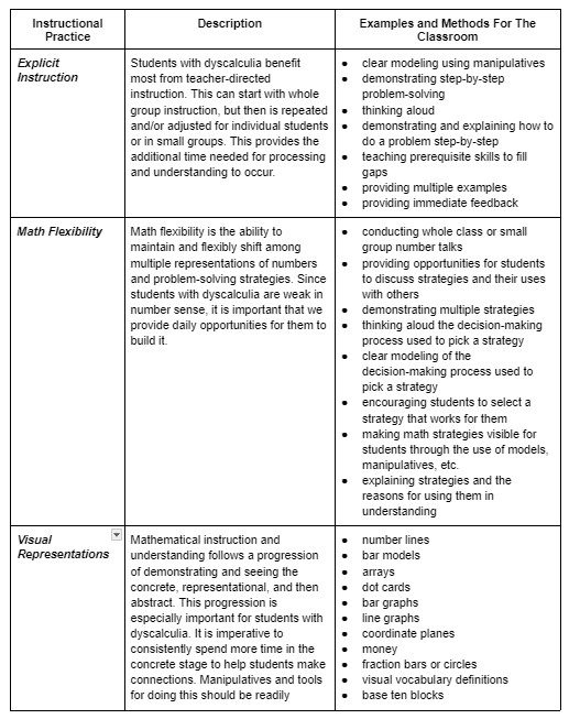 There are two approaches or practices that most teachers use for teaching mathematics: traditional teacher-directed practices and inquiry or student-directed practices. Direct instruction follows an I do, we do, you do model where the teacher shows the students how to do something, the class works together on some problems, often called guided practice, and then students are set loose to work independently on problems. In student-centered instruction, the lesson begins with students working through problems on their own first, generating mathematical knowledge by drawing on what they already know and collaborating with their peers. During this process, students learn multiple strategies for solving problems. At first, the emphasis is on greater mathematical understanding rather than procedural fluency. Students with dyscalculia or who have math deficits benefit most from teacher-directed instruction. This method places less demand on attention, working memory, language, and general cognitive resources. However, students with dyscalculia benefit from learning multiple strategies as they begin to understand mathematical concepts. Some strategies most effective for students with math learning difficulties are explicit instruction, visual representation, student verbalization, using heuristics, and providing ongoing feedback. Depending on the individual student’s needs, an effective plan would include a combination of these practices, as detailed in the table below.