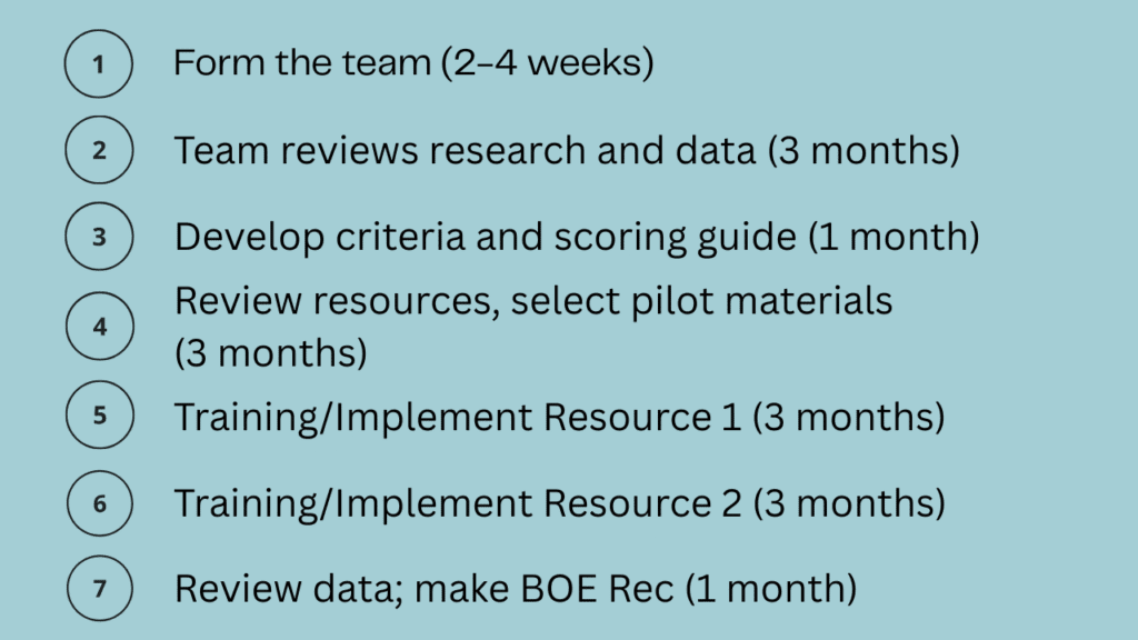 The final step in any successful pilot is clear, proactive communication. The curriculum team made a recommendation to the Board of Education for final approval, and the district notified families of the outcome and shared plans for district-wide implementation. Pilot teachers played a key role in introducing the new program to their peers, often serving as in-building leaders during rollout. Informational meetings were planned to introduce parents to the new resource, share reasons for the change, show data validity, and explain common structures their students might use during implementation.