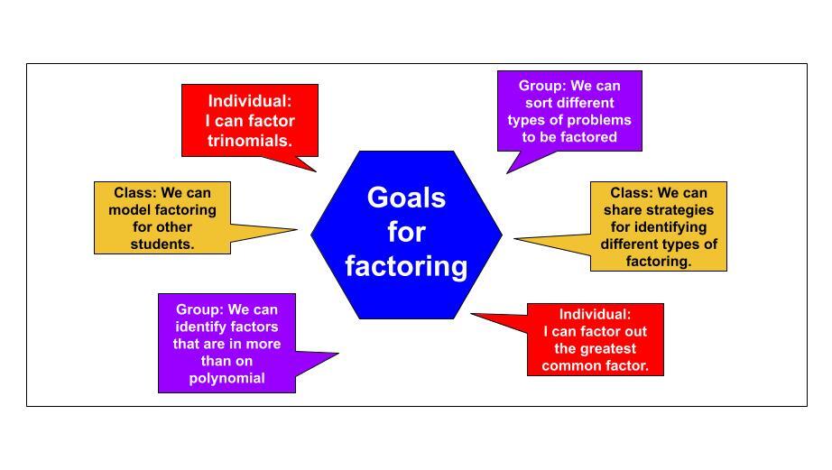 | I can identify zeros of polynomials when suitable factorizations are available. | Goal ideas:I can recognize polynomials that can be factored. I can factor polynomials.I can solve factored polynomials. |